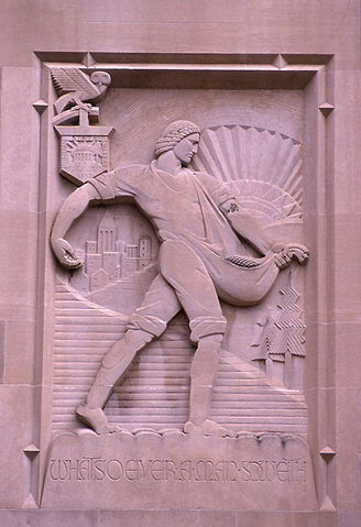 English: Relief of sower on Beaumont Tower, Michigan State University, East Lansing, Michigan