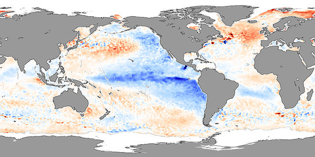 Sea Surface Temperature - November 2007.jpg During La Niña, sea surface temperatures in the eastern tropical Pacific are below average, and temperatures in the western tropical Pacific are above average. This pattern is evident in this temperature anomaly image for November 2007. This image shows the temperature for the top millimeter of the ocean’s surface—the skin temperature—for November 2007 compared to the long-term average. A strong band of blue (cool) water appears along the Equator, particularly strong near South America. Orange to red (warm) conditions appear north and south of this strong blue band. The 2007 data were collected by the Advanced Microwave Scanning Radiometer (AMSR-E) flying on NASA’s Aqua satellite. The long-term average is based on data from a series of sensors that flew on NOAA Pathfinder satellites from 1985 to 1997.