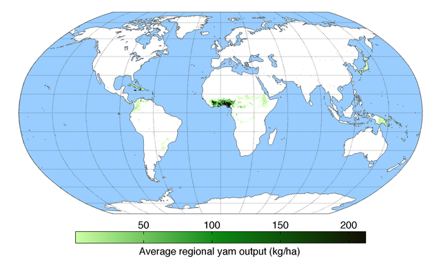 English: Map of yam production (average percentage of land used for its production times average yield in each grid cell) across the world compiled by the University of Minnesota Institute on the Environment with data from: Monfreda, C., N. Ramankutty, and J.A. Foley. 2008. Farming the planet: 2. Geographic distribution of crop areas, yields, physiological types, and net primary production in the year 2000. Global Biogeochemical Cycles 22: GB1022