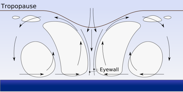 Suomi: Hurrikaanin suurpiirteinen rakenne, nuolet kuvaavat ilmavirtoja