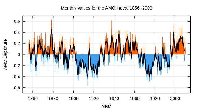 English: Atlantic Multidecadal Oscillation Timeseries with a 12 month moving average (black), 1856–2009
