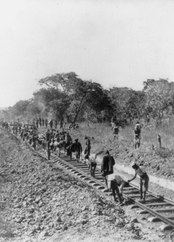 English: The building of a railway as part of Rhodesian Railways near Kabwe, Zambia then Broken Hill sometime around 1906.