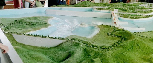 Three Gorges Dam Model - Auxilary South Dam. Main dam to right. Ship lock navigation wider across channel.