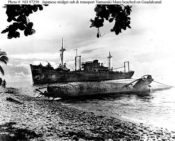 English: Wrecks of Japanese ship Yamazuki Maru and midget submarine on beach at Guadalcanal. Photographed in 1944. U.S. Navy historical image #97250.