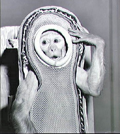 English: The test subject, a rhesus monkey named Sam, is seen encased in a model of the Mercury fibreglass contour couch. He will be flown on the Little Joe 2 as a test subject.