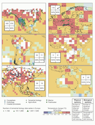English: The diagram shows widespread evidence of warming temperatures having affected many physical and biological systems across the world. From the source, written by Cynthia Rosenzweig (2008): "Researchers from NASA GISS and from 10 other institutions across the world analyzed data from published papers on 829 physical systems and some 28,800 plant and animal systems, stretching back to 1970. [...] In physical systems, 95 percent of observed changes are consistent with warming trends. These include wastage of glaciers on all continents; melting permafrost; earlier spring river runoff; and warming of water bodies. The study also found that 90 percent of documented changes among living creatures are consistent with warming. [...] It is unlikely that any force other than human-influenced global warming could be driving these changes; factors such as deforestation or natural climate variations could not explain it. The work builds upon the consensus of the Intergovernmental Panel on Climate Change, which in 2007 declared human-made climate warming "likely" to have discernible effects on biological and physical systems" (end quote of Rosenzweig, 2008). The diagram itself shows the location and consistency of observed changes with warming. Changes in physical systems include snow, ice and frozen ground as well as hydrology and coastal processes. Changes in biological systems include terrestrial, marine and freshwater biological systems. The diagram also shows linear trends of surface air temperature between 1970 and 2004. The trends in surface air temperature are based on the "HadCRUT3" dataset, which has been developed by the UK Hadley Centre and the Climatic Research Unit (CRU) (Jones and Salmon, 2011). The CRU is based at the University of East Anglia, in the UK. Some parts of the mapped data are white. These areas do not contain sufficient climate data to estimate a trend. "Our findings show that patterns of change are strongest in North America, Asia and Europe, mainly because far more studies have been done there. On the other continents, including South America, Australia and Africa, documentation of changes in physical and biological systems is sparse, even though there is good evidence of human-influenced warming itself. There is an urgent need to study these and other environmental systems, especially in tropical and subtropical areas" (Rosenzweig, 2008).