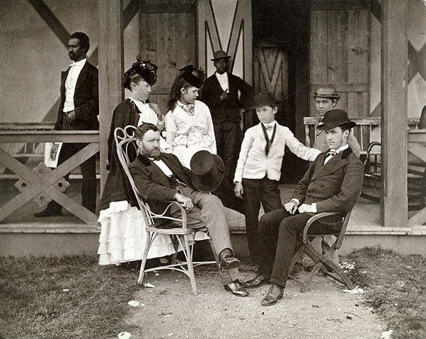 Ulysses Grant and Family at Long Branch, NJ by Pach Brothers, NY, 1870. The Imperial Cabinet Card pictures Grant and wife, Julia Dent, and their four children; Jesse, Ulysses Jr., Nellie, and Frederick in front of their cottage. Also present are two black men, whose identity is unknown.