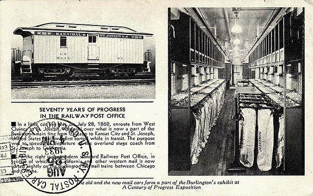 The first RPO (1862) on a picture post card (ppc) published for the 1933 " Century of Progress" Exposition at Chicago, IL, (with Aug. 25, 1933 RPO Exhibit CDS)