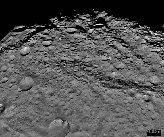 English: An image of densely cratered terrain on Vesta near the terminator, taken by Dawn on August 6, 2011. It has a resolution of about 260 meters per pixel. North is in the direction of "two o'clock".