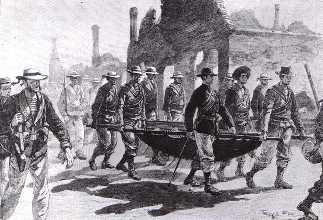 Admiral Seymour returning to Tianjin with his wounded troops. Boxer Rebellion. 1900 drawing. Source: "La Royale", Jean Randier.