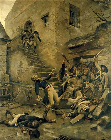 English: In October 1793, the Vendean troops crossed the Loire river to reach Granville, storming into Château-Gonthier on their way. As he died, republican General Beaupuy is said to have cried out : « I couldn't conquer for the Republic, I shall die for her; » The drooping figure of the dying general offers a dramatic contrast with the victorious figure of the saber-wielding enemy.