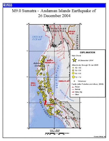 English: Aftershocks of the 2004 Indian Ocean earthquake, with data up to January 10, 2005. This is an updated version of :Image:Neic slav fig72.jpg, with more recent data and smaller file size. Note USGS original is a GIF; file size is 60 kB vs 285 kB