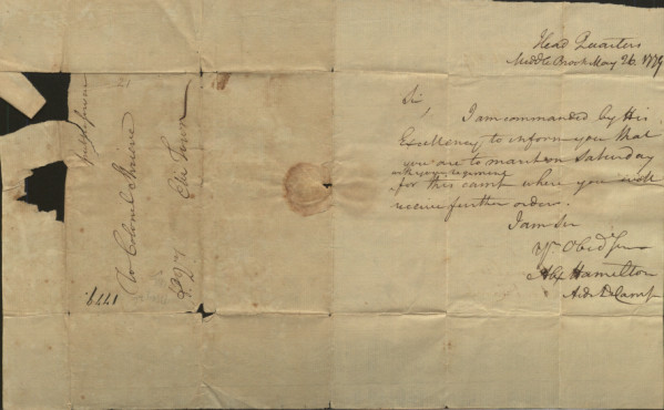 English: Correspondence from Alexander Hamilton to Col. Shreve on May 26, 1779. Sent from Headquarters in Middlebrook. Text:Sir,