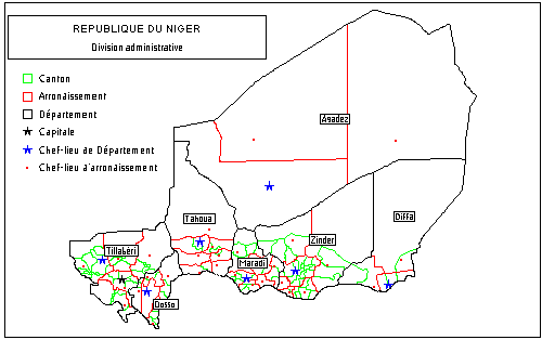 transfer of GFDL user made image from fr:wikipedia. http://fr.wikipedia.org/wiki/Image:Niger_admin.png Reads:"Carte administrative du Niger