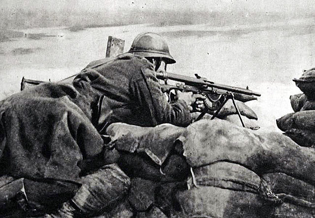 Belgian machinegunner in 1918 guarding trench |