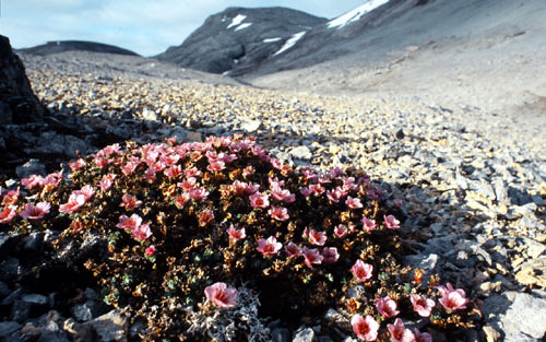 Purple Saxifrage, Saxifraga oppositifolia, at northern part of Ymerdalen, southern Bjoernoeya, July 2002, ba Michael Haferkamp
