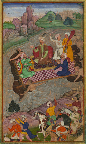English: Illustrations from the Manuscript of Baburnama (Memoirs of Babur) - Late 16th CenturyBāburnāma is the memoirs of Ẓahīr ud-Dīn Muḥammad Bābur (1483-1530), founder of the Mughal Empire and a great-great-great-grandson of Timur. It is an autobiographical work, originally written in the Chagatai language, known to Babur as "Turki" (meaning Turkic), the spoken language of the Andijan-Timurids. Because of Babur's cultural origin, his prose is highly Persianized in its sentence structure, morphology, and vocabulary,and also contains many phrases and smaller poems in Persian. During Emperor Akbar's reign, the work was completely translated to Persian by a Mughal courtier, Abdul Rahīm, in AH (Hijri) 998 (1589-90). These Paintings, being a fragment of a dispersed copy, was executed most probably in the late 10th AH /16th CE century. It contains 30 mostly full-page miniatures in fine Mughal style by at least two different artists. Another major fragment of this work (57 folios) is in the State Museum of Eastern Cultures, Moscow.