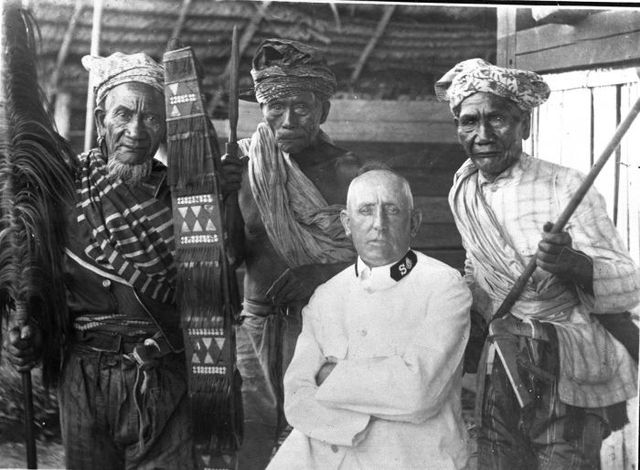 | DescriptionCOLLECTIE TROPENMUSEUM Een kommandant van het Leger des Heils poseert voor de fotograaf met drie Toradja mannen in traditioneel krijgscostuum Celebes TMnr 60011683.jpg |