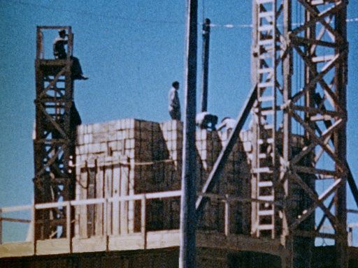 Français : Trinity (essai atomique). Empilement d'explosifs pour le 100 Ton Test. Pour calibrer les instruments de mesures et les divers appareils photographiques, une explosion de 108 tonnes de TNT mélangé à du RDX fut déclenchée le 7 mai 1945. L'amas d'explosif était empilé sur une plateforme en bois à environ 700 mètres de l'hypocentre de Trinity. À l'intérieur du cube explosif se trouvaient des tubes avec environ 1 000 curies de produits radioactifs, dans le but d'analyser leur dispersion et d'évaluer les risques de contamination.