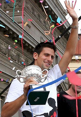 српски / srpski: sr:Новак Ђоковић на балкону Скупштине града Београда, са победничким пехаром Отвореног првенства Аустралије. Снимљено 2. фебруара 2008. / sr:Novak Đoković na balkonu Skupštine grada Beograda, sa pobedničkim peharom Otvorenog prvenstva Australije. Snimljeno 2. februara 2008. English: en:Novak Đoković on the balcony of City of Belgrade Assembly, holding his Australian Open trophy. (cropped) |