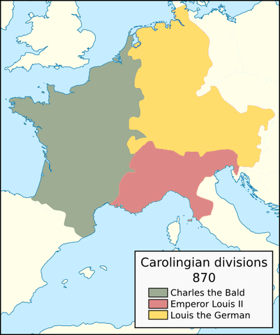 English: The territorial divisions of the Carolingian Empire in 870, following the partition of Meersen. I created this image using Inkscape. I based this map off the ones in: Costambeys, Marios; Innes, Matthew; MacLean, Simon. (2011) The Carolingian World. Cambridge University Press. ISBN 0521564948. pages 403-403.
