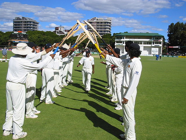 picture of the 'guard of honour' given to Muttiah Muralitharan by his teammates when they came of the field in Harare after Muralitharan broke Courtney Walsh's record. Zimbabwe 2004. |