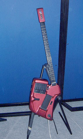 English: SynthAxe is a fretted, guitar-like MIDI controller, created in 1986 by Bill Aitken and manufactured in England in the middle to late 1980s. It is a musical instrument that uses an electronic synthesizer to produce sound and is controlled through the use of an arm which resembles the neck of a guitar in form and in use. The name SynthAxe is a portmanteau of the words Synthesizer and Axe, which is a popular slang term meaning guitar.