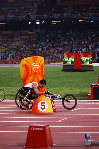 English: Beijing Paralympic Games 2008: Athletics, Men's 200m class T53: Chinese athlete Shiran Yu won with 26.64 seconds