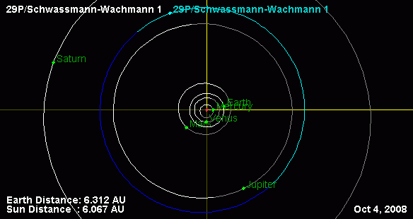 The quasi-circular orbit of 29P/Schwassmann-Wachmann compared to Jupiter and Saturn. |