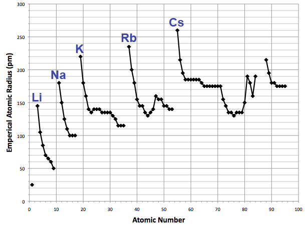 English: A plot of atomic number against empirical atomic radius, measured in picometers, created in Microsoft Excel 2008.