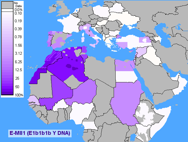 Distribution of Y haplotype EM-81 E1b1b1b in North Africa, West Asia and Europe. Data psuedocolored based on data in Table 1. from (Am J Hum Genet. 2004 May; 74(5): 1023–1034.) Regions with stripes indicate data given twice of a region but substantively different values. For albania, the colors indicate Calabrian Albanians or Albanians, For Israel the colors are either Ashkenazi or Sephardic Jews. The map from which the boundaries were derived was rebordered black, bodies of water were recolored blue. The image was painted in paintbrush. |
