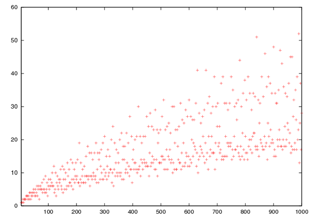 English: A graph showing the number of ways an even number can be written as the sum of two primes (4 <= n <= 1000)