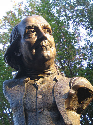 Keys To Community, a nine-foot bronze sculpture of Benjamin Franklin by James Peniston, installed in 2007 in Girard Fountain Park in Philadelphia, Pennsylvania. |