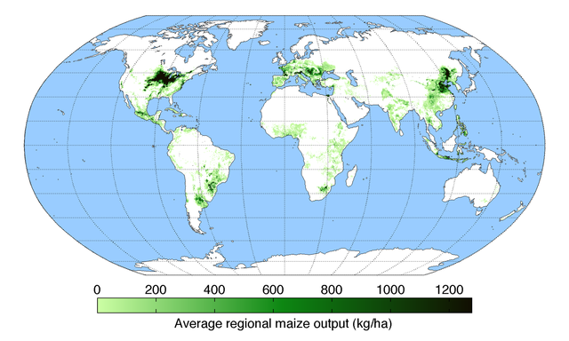 Map of maize production (average percentage of land used for its production times average yield in each grid cell) across the world compiled by the University of Minnesota Institute on the Environment with data from: Monfreda, C., N. Ramankutty, and J.A. Foley. 2008. Farming the planet: 2. Geographic distribution of crop areas, yields, physiological types, and net primary production in the year 2000. Global Biogeochemical Cycles 22: GB1022. doi:10.1029/2007GB002947 |