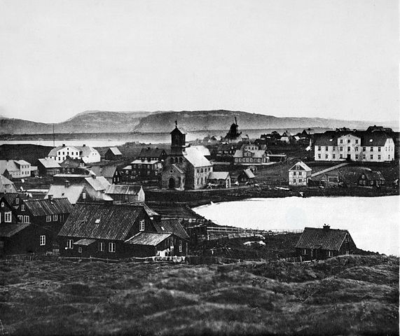 Reykjavík. Of the buildings still standing the most regognizable are the governor's house on the left (amtmannshúsið; stjórnarráðið), the cathedral in the middle (dómkirkjan) and the college on the right (MR). Also seen up in the hill is the Reykjavík mill, which used to be a landmark of Reykjavík, but no longer exists. The Pond (Tjörnin) reaches farther inland than it does now. |
