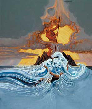 English: Illustration of the fight between Pele, the hawaiian goddess of volcanoes and fire, and Namakaokahai, the hawaiian goddess of water.