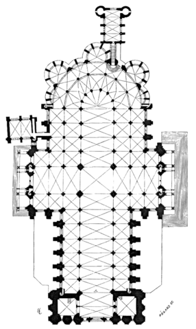 ...La fig. 11 donne le plan de la cathédrale de Chartres. Ici, l'influence religieuse paraît tout entière. Trois grandes chapelles à l'abside, quatre autres moins prononcées entre elles, doubles bas-côtés d'une grande largeur...