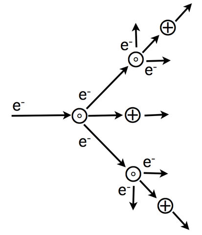 English: Cascade process of ionization. Electrons are ‘e−’, neutral atoms ‘o’, and cations ‘+’. The first impact of an electron on an atom results in one ion and two electrons. Therefore, the number of charged particles increases rapidly (in the millions) only “after about 20 successive sets of collisions”, mainly due to a small mean free path (average distance travelled between collisions). Idea and information from: Leal-Quirós, Edbertho (2004) “Plasma Processing of Municipal Solid Waste”. Brazilian Journal of Physics, vol. 34, no. 4B, p.1587