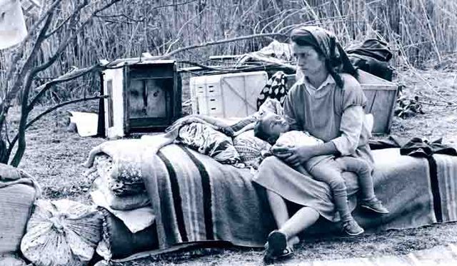 Türkçe: Dağlık-Karabağ savaşı döneminde göç etmek zorunda kalan bir Azeri kadını kucağında bebeğiyle birlikte.