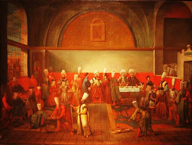 Foreign ambassadors being received at the Topkapı Palace in Istanbul during the reign of Sultan Ahmed III. Painting by Jean-Baptiste van Mour, 1725. Pera Museum, Istanbul.