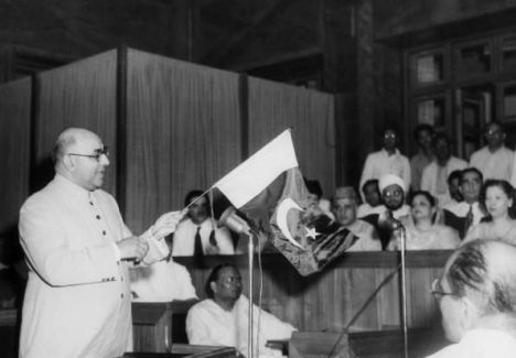 English: Nawabzada Liaquat Ali Khan, first Prime Minister of Pakistan presenting the national flag in the first constituent assembly.