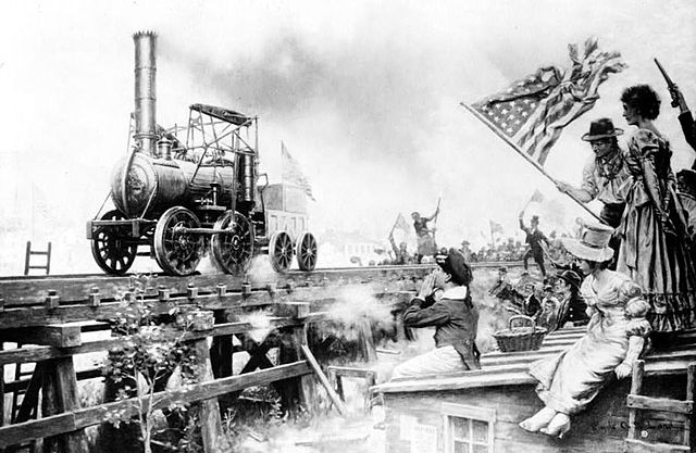 English: Depiction of the first run of the locomotive Stourbridge Lion on August 8, 1829, in Honesdale, Pennsylvania. Painted c. 1916.