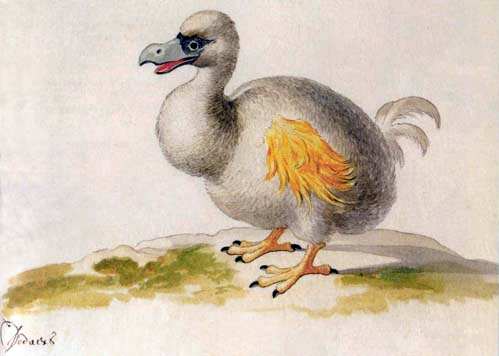 Painting of a white dodo, based on a painting form 1611 by Roelant Savery. This painting itself might have been the basis of later white dodo painting.