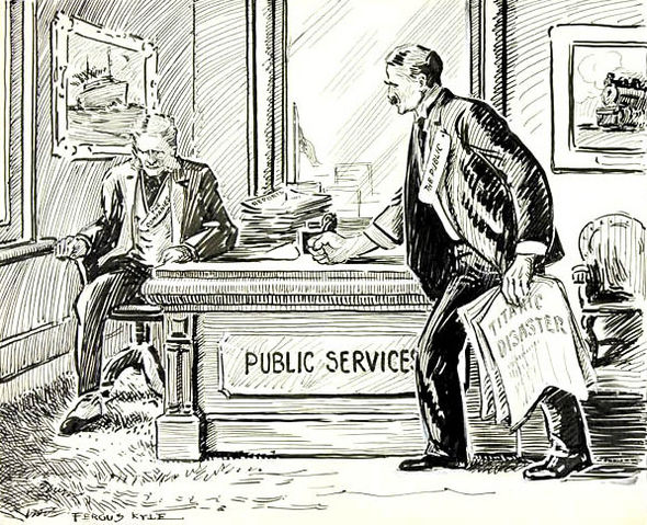 English: The Margin of Safety Is Too Narrow! An original cartoon depicting a man representing the public with a copy of a newspaper with the headline "THE TITANIC" pounding his fist on a "PUBLIC SERVICE" desk belonging to a man representing "The Companies"