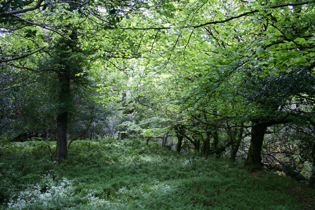 English: Deciduous woodland by the Owengarriff River Deciduous woodland, predominantly beech, between the Owengarriff River and the Old Kenmare Road (now on the Kerry Way footpath), south of Muckross Lake (Loch Mhucrois). The ground here is carpeted with wild garlic