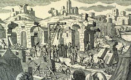 English: Lisbon in the aftermath of the 1755 earthquake, showing persons being hanged in the presence of priests and military officials. One priest is holding a crucifix, one possibly a prayer book, so they could be giving last rites to the persons being hanged (General crime and mayhem occurs nearby).In his ?The Lisbon Earthquake in 1755: The First Modern Disaster,? University of Delaware Disaster Research Centre, Dept. of Sociology and Criminal Justice, 2003, Russell R. Dynes states: ?Security became an issue. It is reported that gallows were set up in several parts of the city as a warning against looting. It was also noted that at least 34 were executed for looting?." Others executed were murderers and arsonists. This is a close-up from The Ruins of Lisbon, a 1755 German engraving. Courtesy of the National Information Service for Earthquake Engineering (NISEE), University of California, Berkeley, with permission permitted under the terms of non-profit sharing agreement (Jan Kozak collection). Original in: Museu da Cidade, Lisbon.