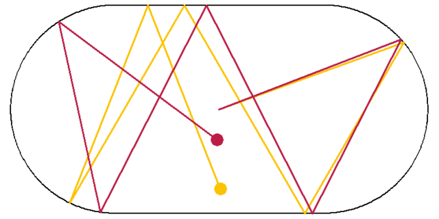 Mathematica source code In[403]:= NN[v_]:=Sqrt[v[[1]]^2+v[[2]]^2]; Ang[v0_,va_,vb_]:=(va-v0).(vb-v0)/NN[va-v0]/NN[vb-v0]; 1st trajectory p0={0,0}; q0=\[Pi]/9; In[334]:= NSolve[(p0[[1]]+t Cos[q0]-1)^2+(p0[[2]]+t Sin[q0])^2==1,t] Out[334]= {{t\[Rule]0.},{t\[Rule]1.87939}} In[335]:= t0=1.8793852415718169`; p1=p0+t0{Cos[q0],Sin[q0]}; q1=-\[Pi]+(ArcCos[p1[[1]]-1]+q0); NSolve[p1[[2]]+t Sin[q1]\[Equal]-1,t] Out[338]= {{t\[Rule]1.89693}} In[180]:= t1=1.896927737347811; p2=p1+t1{Cos[q1],Sin[q1]}; q2=2\[Pi]-q1; NSolve[p2[[2]]+t Sin[q2]\[Equal]1,t] Out[183]= {{t\[Rule]2.3094}} In[202]:= t2=2.3094010767585043; p3=p2+t2{Cos[q2],Sin[q2]}; q3=2\[Pi]-q2; NSolve[(p3[[1]]+t Cos[q3]+1)^2+(p3[]+t Sin[q3])^2==1,t] Out[205]= {{t\[Rule]0.200212},{t\[Rule]2.19472}} In[405]:= t3=2.194718395858327; p4=p3+t3{Cos[q3],Sin[q3]}; Solve[Ang[p4,p3,{-1,0}]\[Equal]Ang[p4,({Cos[t],Sin[t]}+p4),{-1,0}],t] From In[405]:= \!\(\* RowBox[{\(Power::"infy"\), \(\(:\)\(\ \)\), "\<\"Infinite expression \ \\!\\(1\\/0\\^2\\) encountered. \\!\\(\\*ButtonBox[\\\"More\[Ellipsis]\\\", \ ButtonStyle->\\\"RefGuideLinkText\\\", ButtonFrame->None, \ ButtonData:>\\\"Power::infy\\\"]\\)\"\>"}]\) From In[405]:= \!\(\* RowBox[{\(Solve::"ifun"\), \(\(:\)\(\ \)\), "\<\"Inverse functions are \ being used by \\!\\(Solve\\), so some solutions may not be found; use Reduce \ for complete solution information. \ \\!\\(\\*ButtonBox[\\\"More\[Ellipsis]\\\", ButtonStyle->\\\"RefGuideLinkText\ \\\", ButtonFrame->None, ButtonData:>\\\"Solve::ifun\\\"]\\)\"\>"}]\) Out[407]= {{t\[Rule]1.0472},{t\[Rule]1.19548}} In[328]:= q4=1.1954752520981573; NSolve[p4[[2]]+t Sin[q4]\[Equal]1,t] Out[329]= {{t\[Rule]2.04289}} In[440]:= t4=2.0428873267106815`; p5=p4+t4{Cos[q4],Sin[q4]}; q5=2\[Pi]-q4; 2 nd trajectory In[384]:= P0={0,0}; Q0=\[Pi]/9+\[Pi]/180; In[386]:= NSolve[(P0[[1]]+t Cos[Q0]-1)^2+(P0[[2]]+t Sin[Q0])^2==1,t] Out[386]= {{t\[Rule]0.},{t\[Rule]1.86716}} In[387]:= T0=1.8671608529944035`; P1=P0+T0{Cos[Q0],Sin[Q0]}; Q1=-\[Pi]+(ArcCos[P1[[1]]-1]+Q0); NSolve[P1[[2]]+t Sin[Q1]\[Equal]-1,t] Out[390]= {{t\[Rule]1.87331}} In[391]:= T1=1.8733090735550966`; P2=P1+T1{Cos[Q1],Sin[Q1]}; Q2=2\[Pi]-Q1; NSolve[P2[[2]]+t Sin[Q2]\[Equal]1,t] Out[394]= {{t\[Rule]2.24465}} In[395]:= T2=2.2446524752687225`; P3=P2+T2{Cos[Q2],Sin[Q2]}; Q3=2\[Pi]-Q2; NSolve[(P3[[1]]+t Cos[Q3]+1)^2+(P3[]+t Sin[Q3])^2==1,t] Out[398]= {{t\[Rule]0.341712},{t\[Rule]2.23354}} In[419]:= T3=2.233539454680641`; P4=P3+T3{Cos[Q3],Sin[Q3]}; Solve[Ang[P4,P3,{-1,0}]\[Equal]Ang[P4,({Cos[t],Sin[t]}+P4),{-1,0}],t] From In[419]:= \!\(\* RowBox[{\(Power::"infy"\), \(\(:\)\(\ \)\), "\<\"Infinite expression \ \\!\\(1\\/0\\^2\\) encountered. \\!\\(\\*ButtonBox[\\\"More\[Ellipsis]\\\", \ ButtonStyle->\\\"RefGuideLinkText\\\", ButtonFrame->None, \ ButtonData:>\\\"Power::infy\\\"]\\)\"\>"}]\) From In[419]:= \!\(\* RowBox[{\(Solve::"ifun"\), \(\(:\)\(\ \)\), "\<\"Inverse functions are \ being used by \\!\\(Solve\\), so some solutions may not be found; use Reduce \ for complete solution information. \ \\!\\(\\*ButtonBox[\\\"More\[Ellipsis]\\\", ButtonStyle->\\\"RefGuideLinkText\ \\\", ButtonFrame->None, ButtonData:>\\\"Solve::ifun\\\"]\\)\"\>"}]\) Out[421]= {{t\[Rule]1.09956},{t\[Rule]1.76035}} In[423]:= Q4=1.786499618850784`; NSolve[(P4[[1]]+t Cos[Q4]+1)^2+(P4[]+t Sin[Q4])^2==1,t] Out[424]= \!\({{t \[Rule] \(-2.961831812996791`*^-16\)}, {t \[Rule] 1.874216860919306`}}\) In[428]:= T4=1.874216860919306`; P5=P4+T4{Cos[Q4],Sin[Q4]}; Solve[Ang[P5,P4,{-1,0}]\[Equal]Ang[P5,({Cos[t],Sin[t]}+P5),{-1,0}],t] From In[428]:= \!\(\* RowBox[{\(Power::"infy"\), \(\(:\)\(\ \)\), "\<\"Infinite expression \ \\!\\(1\\/0\\^2\\) encountered. \\!\\(\\*ButtonBox[\\\"More\[Ellipsis]\\\", \ ButtonStyle->\\\"RefGuideLinkText\\\", ButtonFrame->None, \ ButtonData:>\\\"Power::infy\\\"]\\)\"\>"}]\) From In[428]:= \!\(\* RowBox[{\(Solve::"ifun"\), \(\(:\)\(\ \)\), "\<\"Inverse functions are \ being used by \\!\\(Solve\\), so some solutions may not be found; use Reduce \ for complete solution information. \ \\!\\(\\*ButtonBox[\\\"More\[Ellipsis]\\\", ButtonStyle->\\\"RefGuideLinkText\ \\\", ButtonFrame->None, ButtonData:>\\\"Solve::ifun\\\"]\\)\"\>"}]\) Out[430]= {{t\[Rule]-1.35509},{t\[Rule]-0.642004}} In[432]:= Q5=-0.6420035368814776`; Illustration In[451]:= Show[Graphics[{ Thickness[.003], Line[{{-1,-1},{1,-1}}], Line[{{-1,1},{1,1}}], Circle[{1,0},1,{-\[Pi]/2,\[Pi]/2}], Circle[{-1,0},1,{\[Pi]/2,3\[Pi]/2}], RGBColor[254/256,194/256,0], Thickness[.0051],PointSize[.03], Line[{p0,p0+t0{Cos[q0],Sin[q0]}}], Line[{p1,p1+t1{Cos[q1],Sin[q1]}}], Line[{p2,p2+t2{Cos[q2],Sin[q2]}}], Line[{p3,p3+t3{Cos[q3],Sin[q3]}}], Line[{p4,p4+t4{Cos[q4],Sin[q4]}}], Line[{p5,p5+1.9{Cos[q5],Sin[q5]}}], Point[p5+1.9{Cos[q5],Sin[q5]}], RGBColor[188/256,30/256,71/256], Line[{P0,P0+T0{Cos[Q0],Sin[Q0]}}], Line[{P1,P1+T1{Cos[Q1],Sin[Q1]}}], Line[{P2,P2+T2{Cos[Q2],Sin[Q2]}}], Line[{P3,P3+T3{Cos[Q3],Sin[Q3]}}], Line[{P4,P4+T4{Cos[Q4],Sin[Q4]}}], Line[{P5,P5+1.9{Cos[Q5],Sin[Q5]}}], Point[P5+1.9{Cos[Q5],Sin[Q5]}] }],AspectRatio\[Rule]Automatic] |