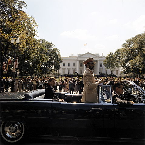 English: Parade, Union Station to Blair House, honoring Emperor of Ethiopia. President Kennedy, Emperor Haile Selassie, Chief of White House Secret Service detail Jerry Behn, Air Force Aide Gen. Godfrey T. McHugh, spectators. Washington, D.C., in front of White House., 10/01/1963