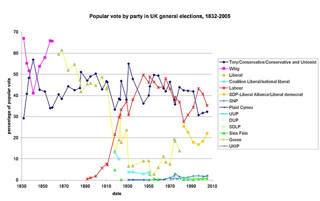English: Popular vote by party in UK in general elections, 1832-2005.