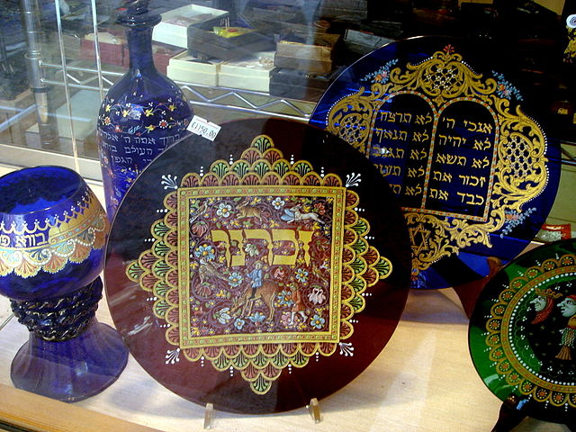 English: Glass, painted dish displaying Hebrew inscriptions, in the window of a shop catering to Jewish tourists in the former Ghetto in Venice, Italy. Picture by Giovanni Dall'Orto, August 1 2008.